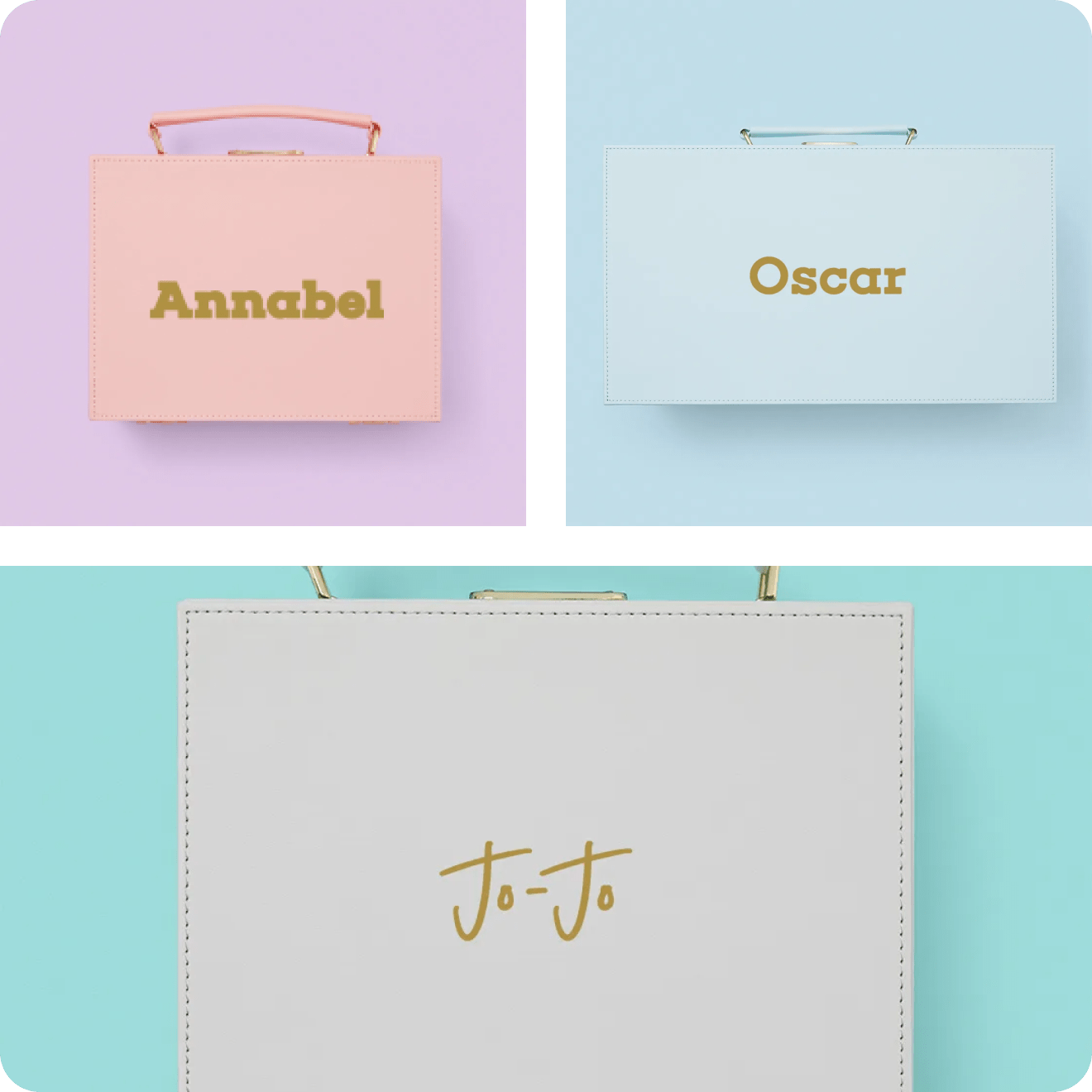 We know that customisation, personalisation and relevancy in your online shopping experience is here to stay. So you can create your own baby gift and fully customise this with your special touches. Firstly you can choose either a baby suitcase (grey, pink or blue) or a super practical vegan leather draw string bag.